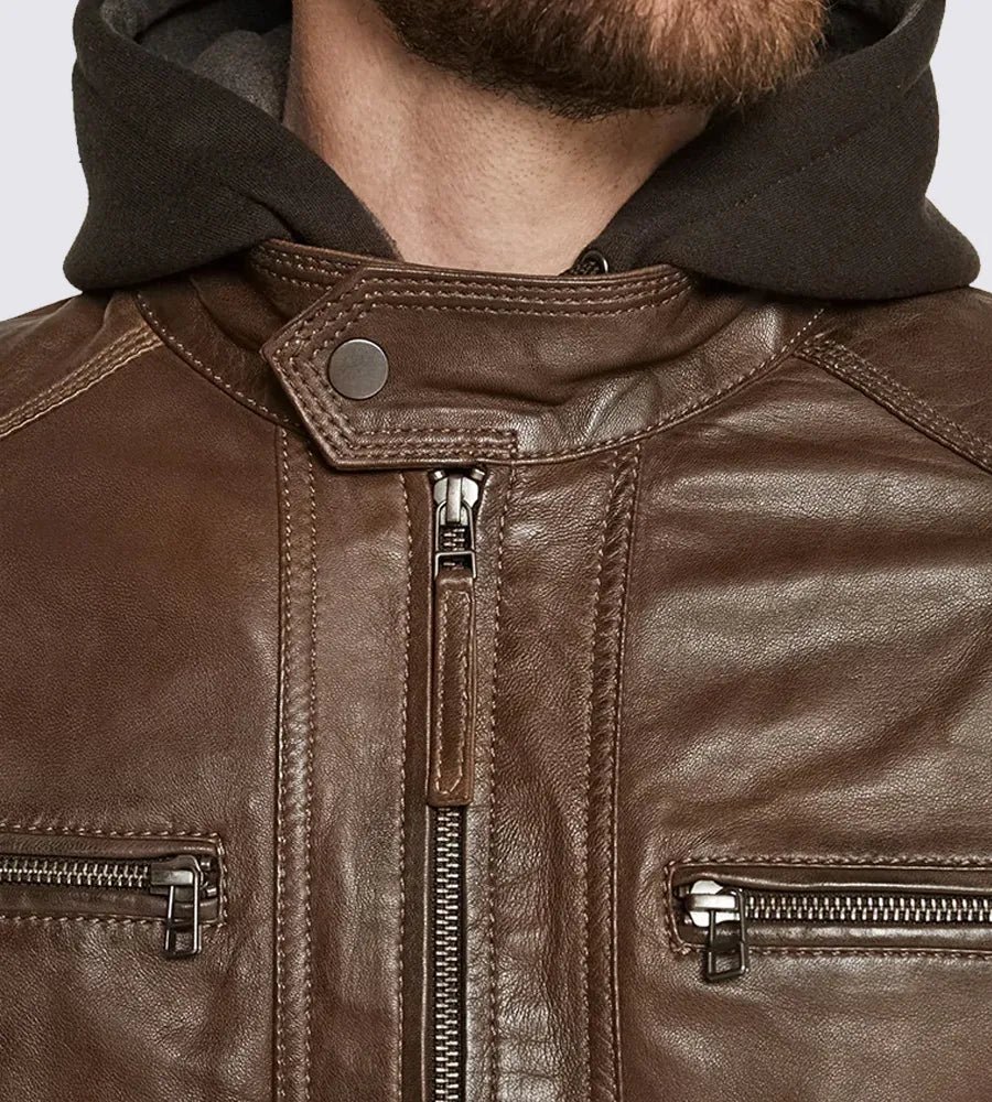 Shop Dark Brown Hooded Motorcycle Leather Jacket
