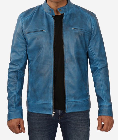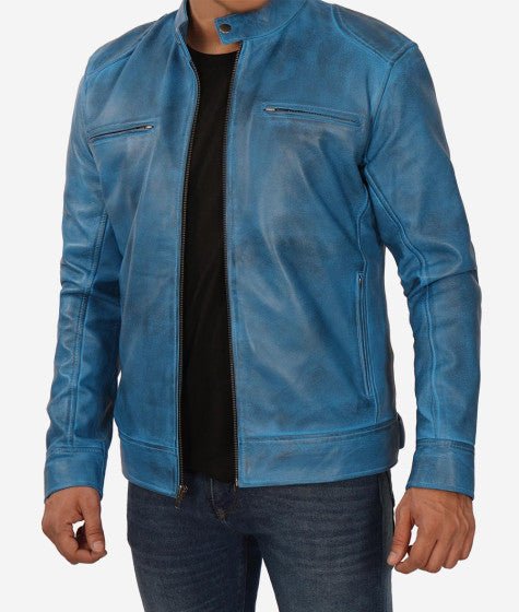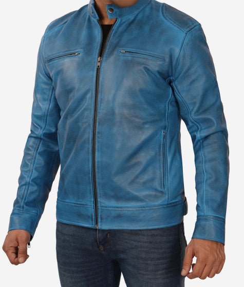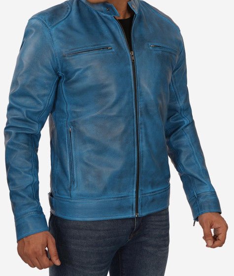 Shop Mens Blue Lambskin Leather Cafe Racer Jacket